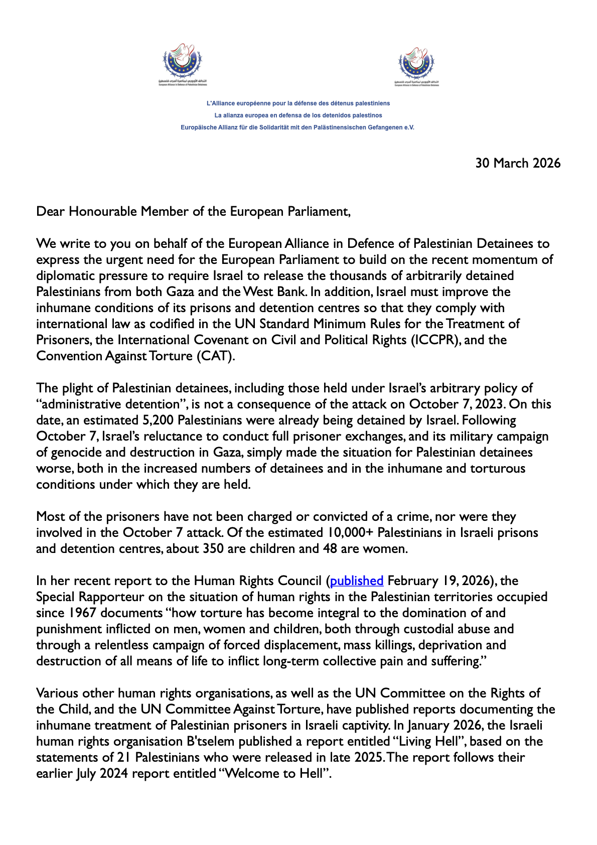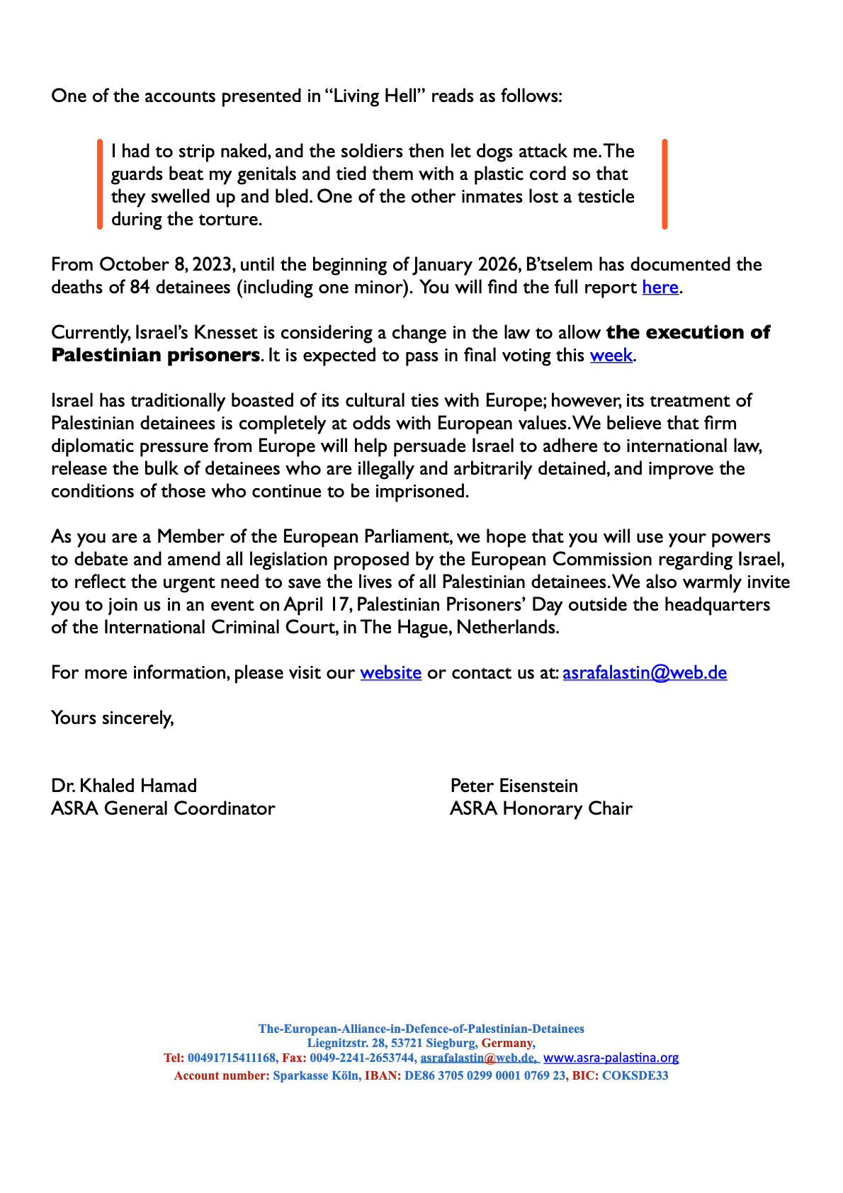 ASRA invites 719 Members of the European Parliament to join us on April 17 in front of the ICJ to observe Palestinian Prisoners’ Day